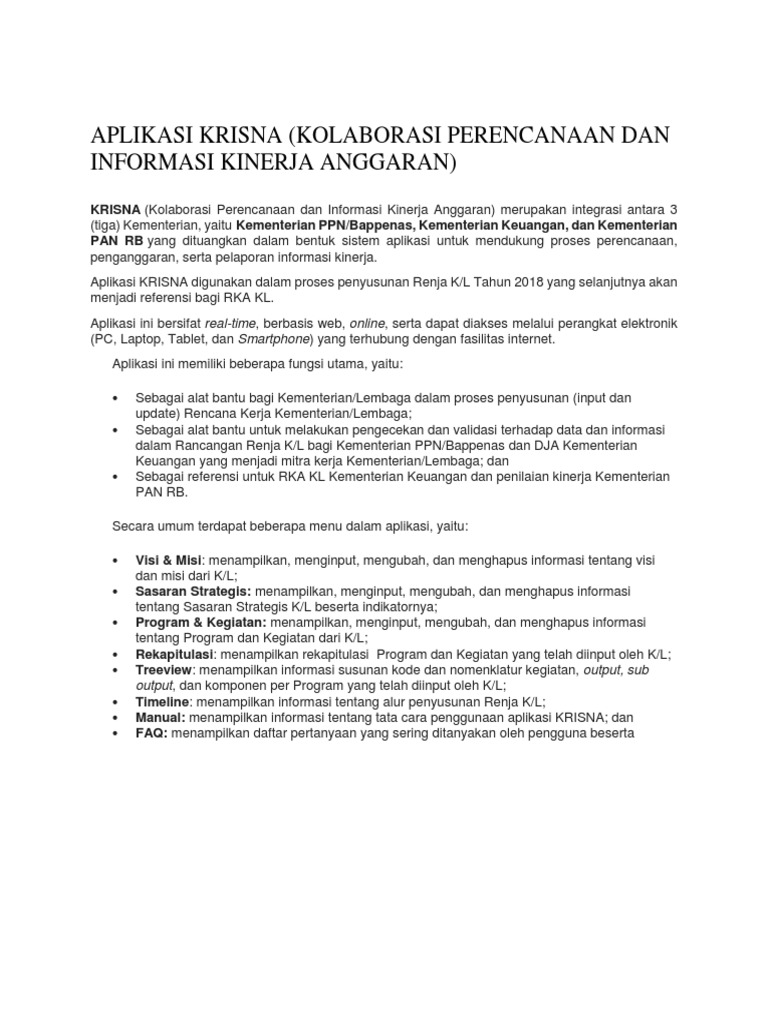 Krisna.systems is tracked by us since december, 2017. Tapi aplikasi krisna yang nah, kalau si krisna ini aplikasi hasil kerja sama tiga kementerian, kementerian ppn/bappenas. Akun resmi kementerian perencanaan pembangunan nasional/bappenas republik indonesia dikelola biro hubungan masyarakat dan tata usaha. Tutorial krisna meliputi beberapa sub sistem yang terus berkembang, yakni Krisna adalah kolaborasi perencanaan dan informasi kinerja anggaran dengan mengintegrasikan sistem dari 3 kementerian, yakni kementerian ppn/bappenas, kementerian keuangan.